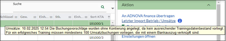 Sie können jetzt auch für Betriebe die Buchungsvorschläge aktivieren, die gerade erst für die Daten­drehscheibe freigeschaltet wurden. Bisher mussten mindestens 100 Buchungen mit Bankauszugs­daten im Kontierassistenten in ADNOVA finance vorliegen, damit die KI eine Trainingsgrundlage hatte.