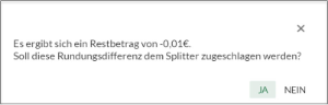 Liegt der Restbetrag bei der Verbuchung über die Splittbetragsroutine bei 0,02 Euro oder darunter, wird der Betrag auf Nachfrage dem letzten Splitter hinzugerechnet. So können Sie Splitter noch schneller abschließen.