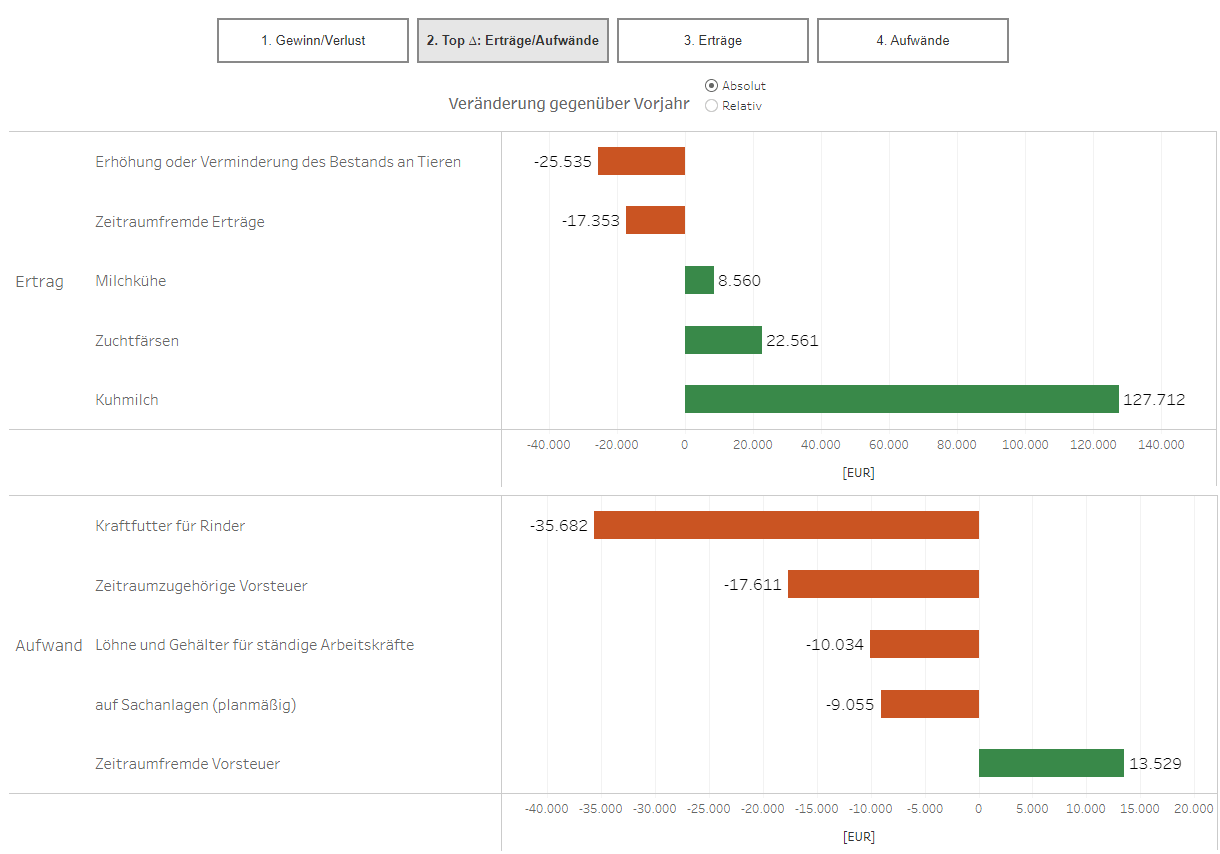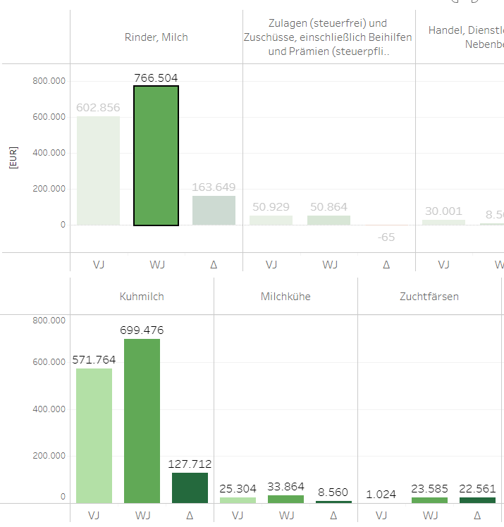 In den Diagrammen für die Erträge (Seite 3) und Aufwände (Seite 4) können sie sich durch einen Mausklick auf einzelne Säulen weitere Detailebenen anzeigen lassen. Beispiel: Durch einen Mausklick auf die Säule WJ im Bereich Rinder, Milch wird Ihnen im unteren Bereich des Bildschirms ein weiteres Diagramm für die Erträge auf den einzelnen Konten (z.B. Kuhmilch, Milchkühe, Zuchtfärsen etc.) dargestellt.