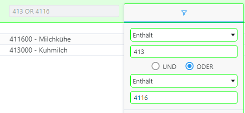 ![]() | In den Kontennachweisen zur Bilanz sowie Gewinn- und Verlustrechnung haben Sie die Möglichkeit auf bestimmte Konten zu filtern. Sofern Sie auf zwei Konten filtern möchten, klicken Sie auf das Filtersymbol, wählen "OR" aus und tragen das entsprechende Konto als zweiten Filter ein.