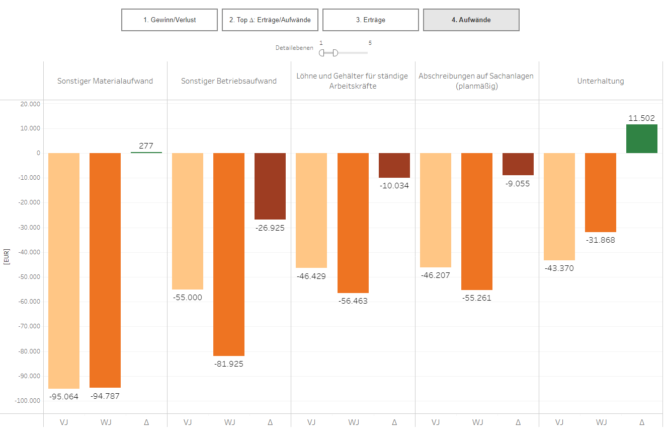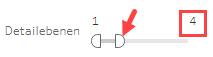 ![]() | Für die Diagramme Erträge (Seite 3) und Aufwände (Seite 4) können sie einstellen, wie viele Detailebenen dargestellt werden sollen. Die Auswahl erfolgt durch Verschiebung des rechten Halbkreises oder durch die Eingabe einer abweichenden Anzahl an Detailebenen. |