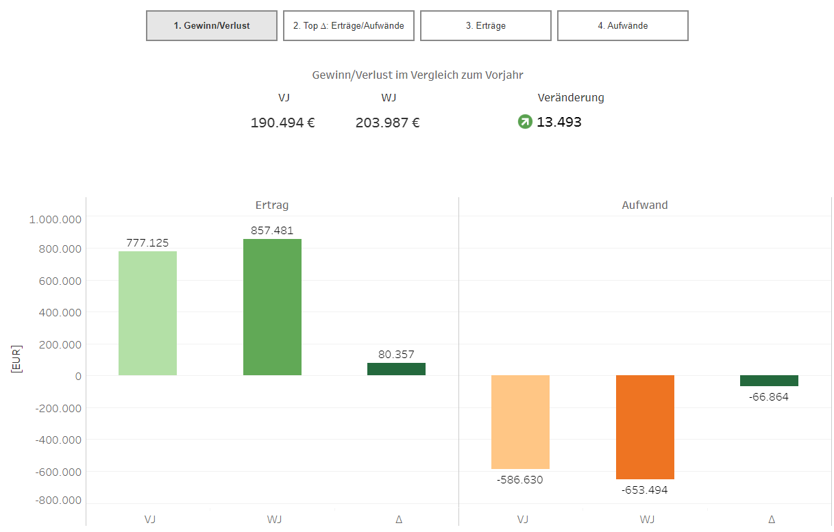 ![]() | Für das Diagramm Erträge/Aufwände (Seite 2) können Sie wählen, ob die Ertrags- und Aufwandspositionen mit den absolut größten Veränderungen |