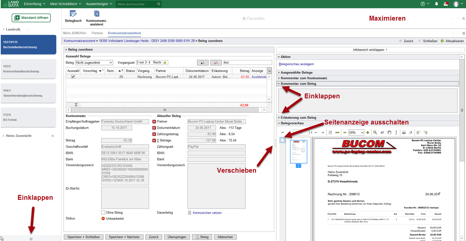 Sobald Sie eine Buchung in den Umsatzbuchungen aufrufen, mit der ein Beleg verknüpft ist, wird dieser Beleg in der Belegvorschau von ADNOVA+ angezeigt. Natürlich muss ADNOVA+ dafür geöffnet sein.
