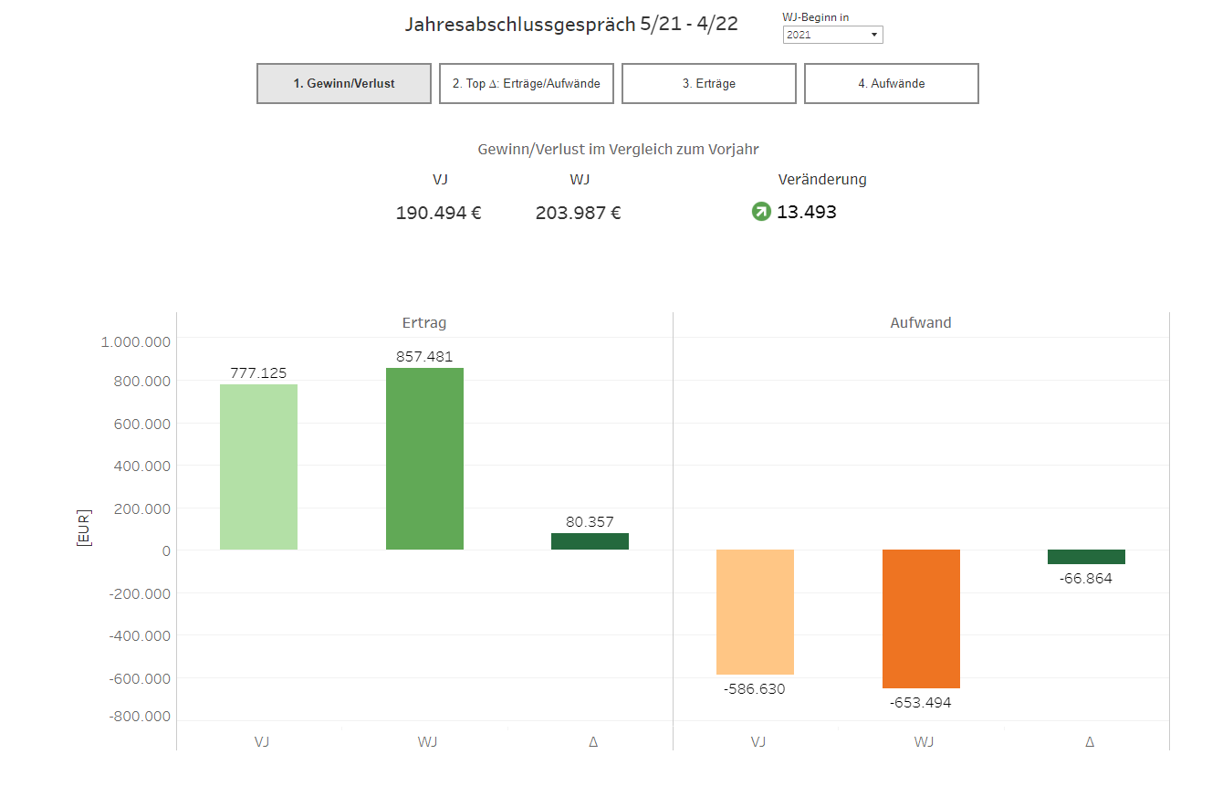 Beim Aufruf der Auswertung werden Ihnen zunächst die wichtigsten Kennzahlen Ihres Jahresabschlusses grafisch aufbereitet dargestellt.