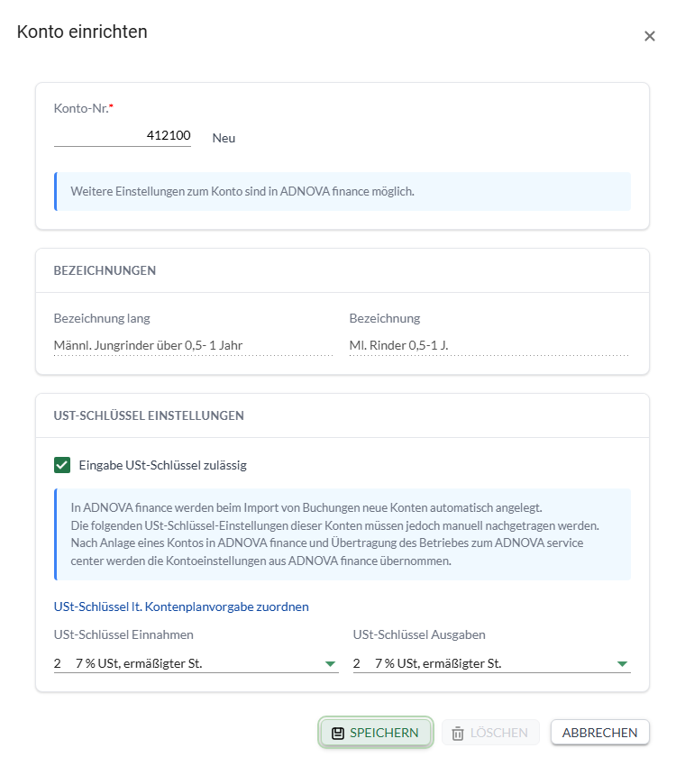 Die neu angelegten Konten werden in ADNOVA finance mit den Vorgaben von ADNOVA finance angelegt. Das bedeutet, dass die in den Buchungsvorschlägen vorgenommenen Kontoeinstellungen - insbesondere zu den USt-Schlüsseln - in ADNOVA finance nachbearbeitet werden müssen, wenn sie beibehalten werden sollen.