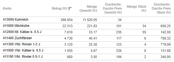 Durch die gleiche Vorgehensweise können Sie sich anschließend die nächste Detailebene z.B. für den Bereich "Rinder, Milch" anzeigen lassen.