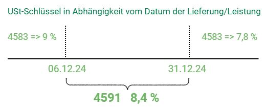 Um den Durchschnittssteuersatz von 8,4 % in der Buchhaltung korrekt abzubilden, wurden in ADNOVA+ spezielle USt-Schlüssel aufgenommen. Diese sind für den begrenzten Zeitraum vom 06.12.2024 bis 31.12.2024 anzuwenden, z. B. der Schlüssel 4591 für diejenigen Umsätze bzw. Lieferungen und Leistungen, die dem Ausgangssteuersatz i. H. v. 8,4 % unterliegen.