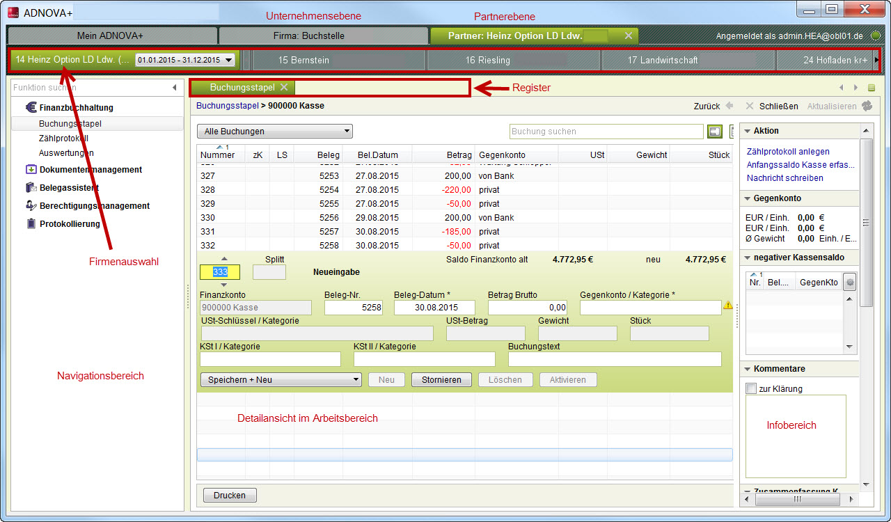 | Hauptbereich | Organisationen: Im Hauptbereich kann zwischen Mein ADNOVA+ und den zwei Ebenen Unternehmensebene sowie Partnerebene gewechselt werden. Über die Partnerebene bearbeiten Sie die Mandanten. Zur Information wird Ihr Benutzername angezeigt. Unternehmer: Neben dem Einstiegsbildschirm Mein ADNOVA+ steht Ihnen der Bearbeitungsbereich zur Verfügung. Unterschiedliche Ebenen gibt es für Unternehmer nicht. | ||||||||