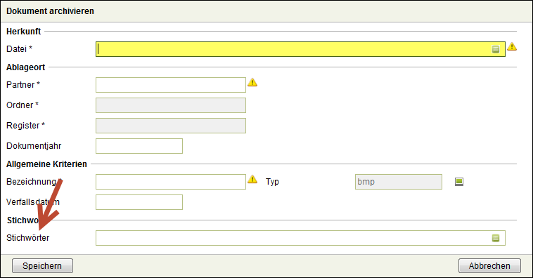 Anschließend können über die Funktion Dokumentenmanagement - Einstellungen - Unternehmen - Stichwort einzelne Stichwörter eingerichtet werden.