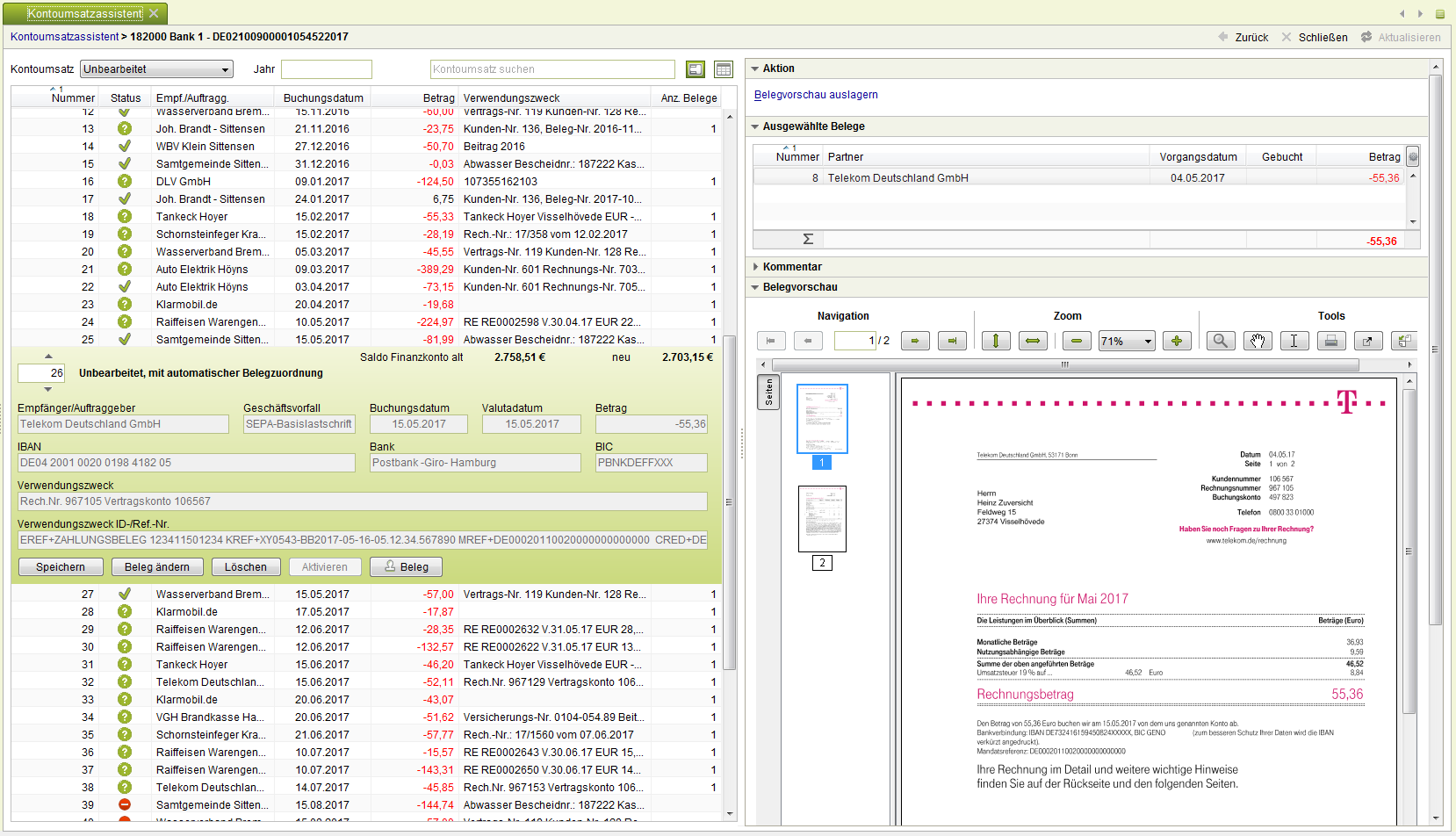Die Anzeige der Dokumente im Belegassistenten wurde optimiert. Individuelle Einstellungen wie die Breite des Anzeigefensters, der Zoomfaktor und die Seiteneinstellung werden ge­spei­chert, so dass Belege beim nächsten Aufruf identisch angezeigt werden.