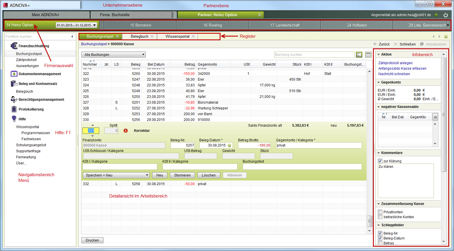 | Hauptbereich | Organisationen: Im Hauptbereich kann zwischen Mein ADNOVA+ und den zwei Ebenen Unternehmensebene sowie Partnerebene gewechselt werden. Über die Partnerebene bearbeiten Sie die Mandanten. Zur Information wird Ihr Benutzername angezeigt. Unternehmer: Neben dem Einstiegsbildschirm Mein ADNOVA+ steht Ihnen der Bearbeitungsbereich zur Verfügung. Unterschiedliche Ebenen gibt es für Unternehmer nicht. | ||||||||