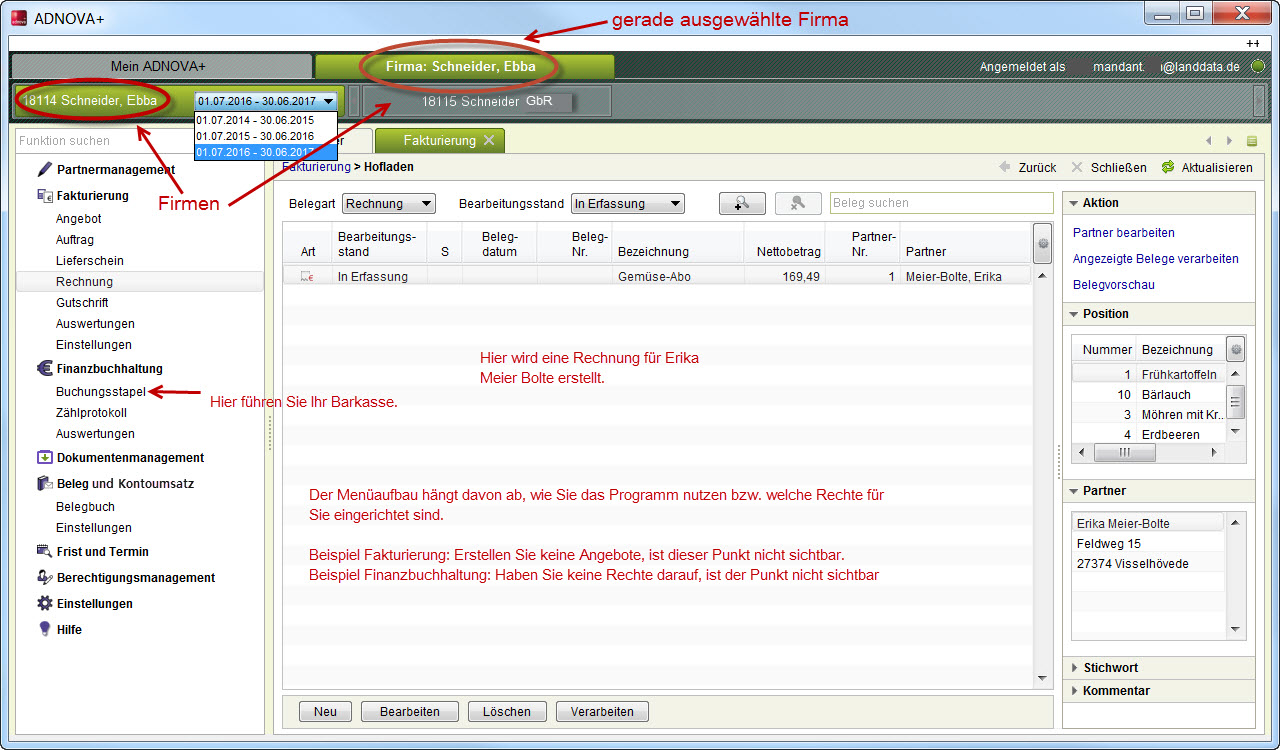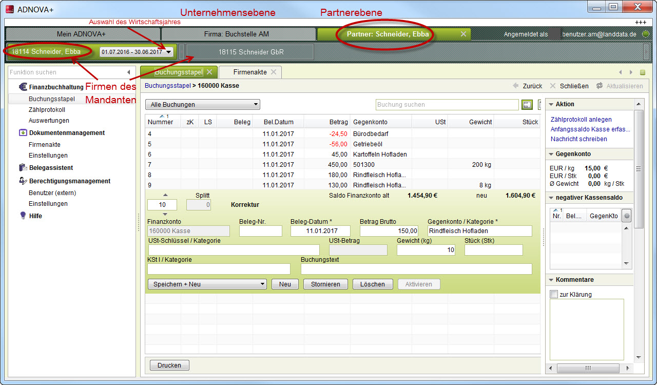 Beispiel Buchstelle - Sie stehen auf der Partnerebene, d. h. Sie haben die Mandantin Ebba Schneider zur Bearbeitung geöffnet.