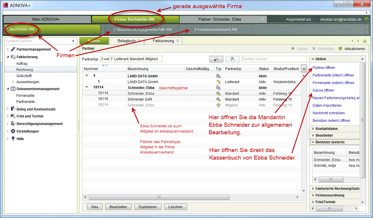 Beispiel Buchstelle - Sie stehen auf der Unternehmensebene in der Partnerübersicht der Firma Buchstelle AM. Die Mandantin Ebba Schneider ist ausgewählt (grau hinterlegt).