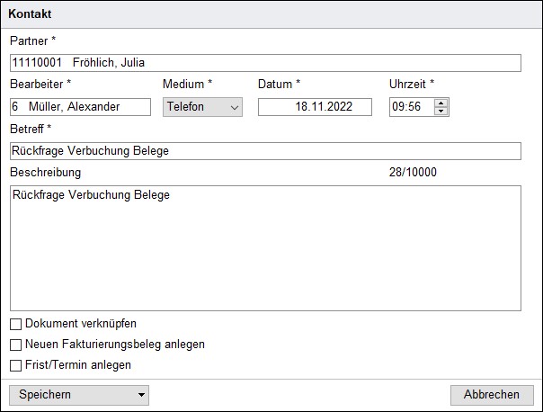 Hier haben Sie die Möglichkeit den Kontakt zu erfassen und mit weiteren Melkmalen, wie beispielsweise Medium, zu ergänzen und mit einem Dokument aus dem Dokumentenmanagement zu verknüpfen.