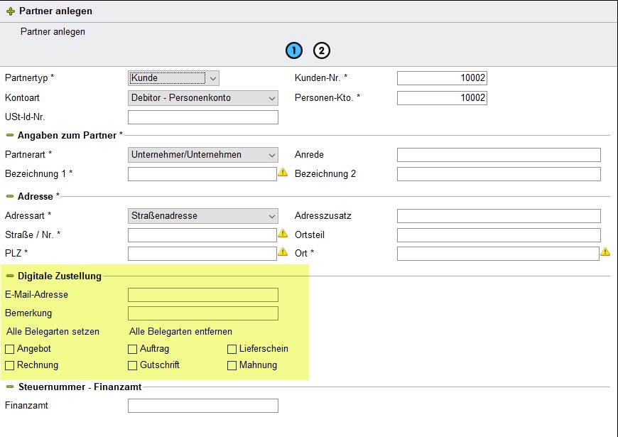 Bei der Schnellerfassung von Partnern im Rahmen der Belegerfassung kann direkt die Freischaltung für den digitalen Belegversand vorgenommen werden.