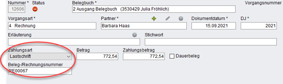 Die Beleg-/Rechnungsnummer wird durch die automatische Belegerkennung gefüllt.