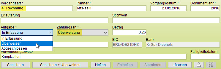 9. Im Belegbuch wird die Aufgabe auf den Status Abgeschlossen gesetzt und so gekennzeichnet, dass die Überweisung erledigt ist.