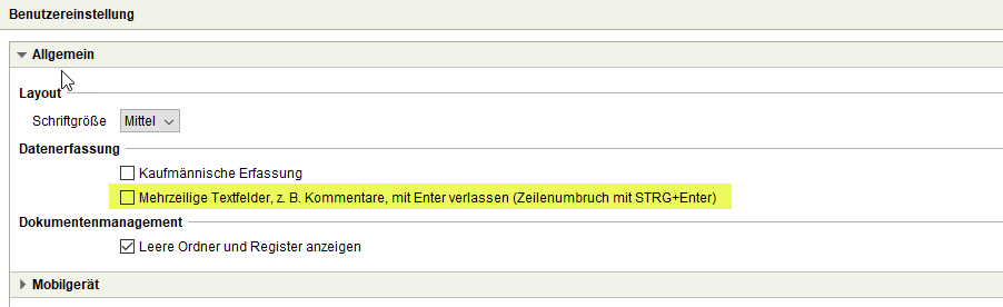 Wenn das aktuelle Verfahren (Enter führt zum nächsten Feld) beibehalten werden soll, kann dies in den Einstellungen definiert werden. Dazu ist unter Einstellungen - Benutzereinstellungen die Option Mehrzeilige Textfelder, z. B. Kommentare, mit Enter verlassen zu aktivieren.