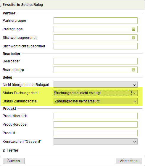 Über die erweiterte Suche in der Rechnungsübersicht besteht jetzt die Möglichkeit auf Belege zu filtern, die noch nicht an die Buchhaltung übergeben wurden bzw. noch nicht in eine Zahlungsdatei übernommen wurden.