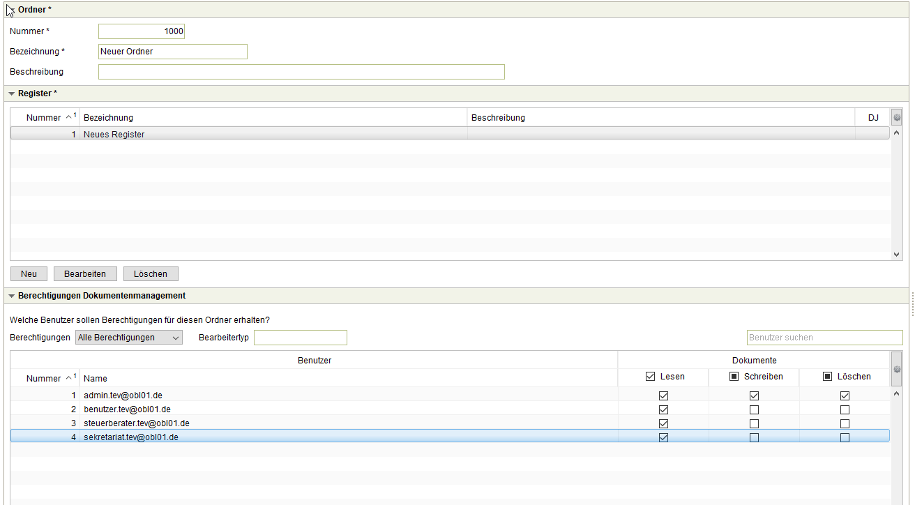 Bei der Anlage sind für alle in Frage kommenden Benutzer Zugriffsrechte auf die neuen Ordner und Register zu vergeben.