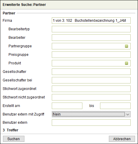 Mit Hilfe der erweiterten Suche ist eine Eingrenzung der Partnerübersicht auf alle Partner möglich, auf die ein externer Benutzer Zugriff hat (Option Benutzer extern mit Zugriff - Auswahl Ja).