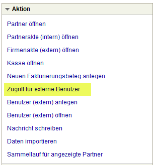 Die Aktion ist nur sichtbar, wenn ein Betrieb (Partner) gewählt wurde, zu dem ein oder mehrere zum dazugehörigen Geschäftspartner angelegte externe Benutzer noch keinen Zugriff haben.
