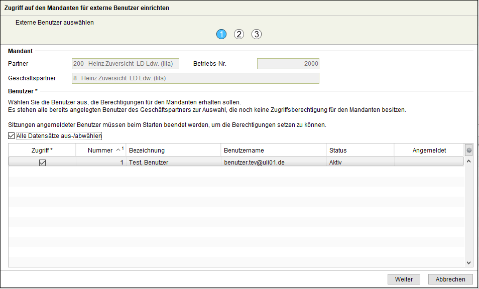 Die Auswahl Nein führt zur Eingrenzung auf alle Partner (Betriebe), auf die kein externer Benutzer Zugriff hat.